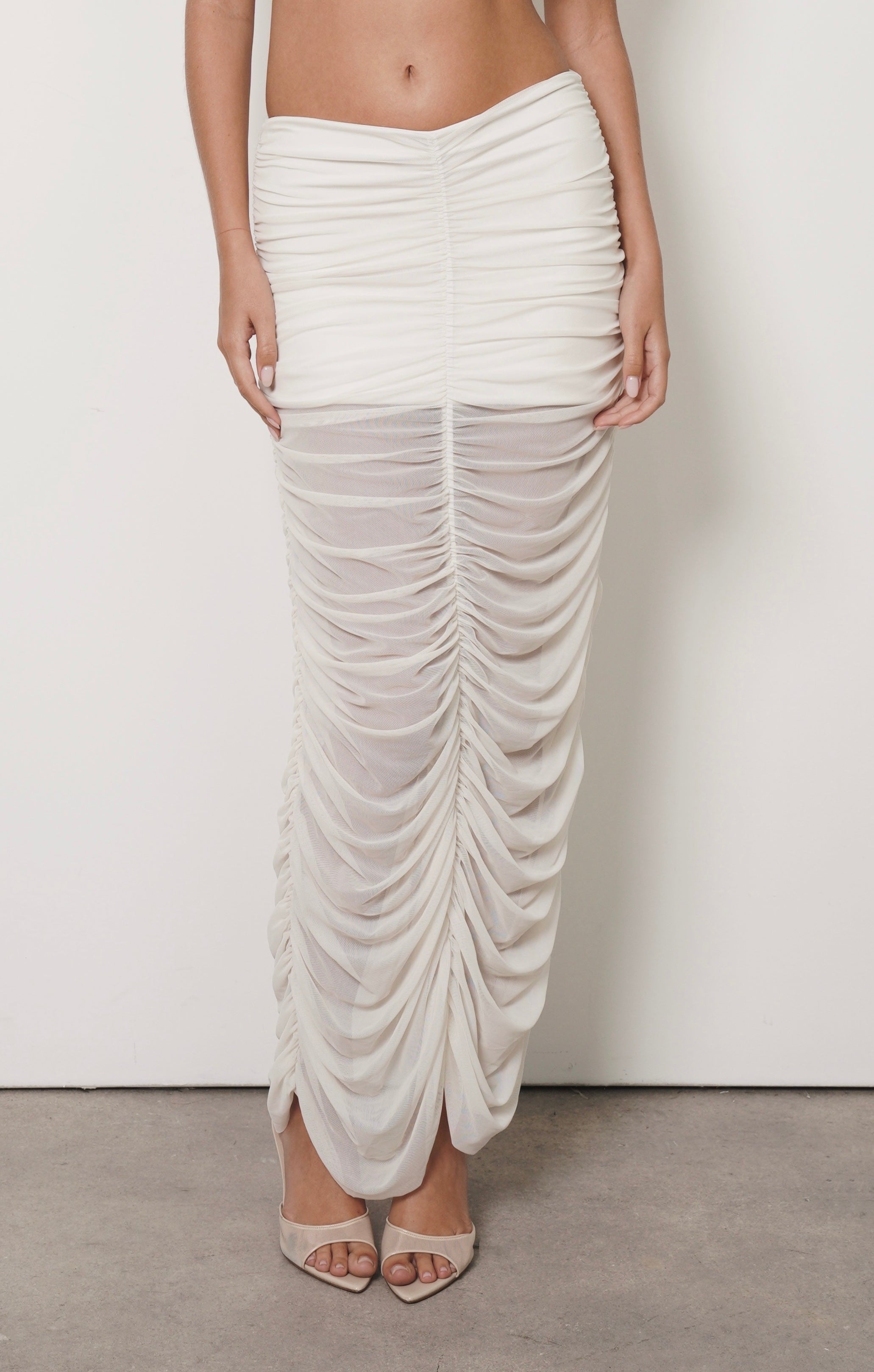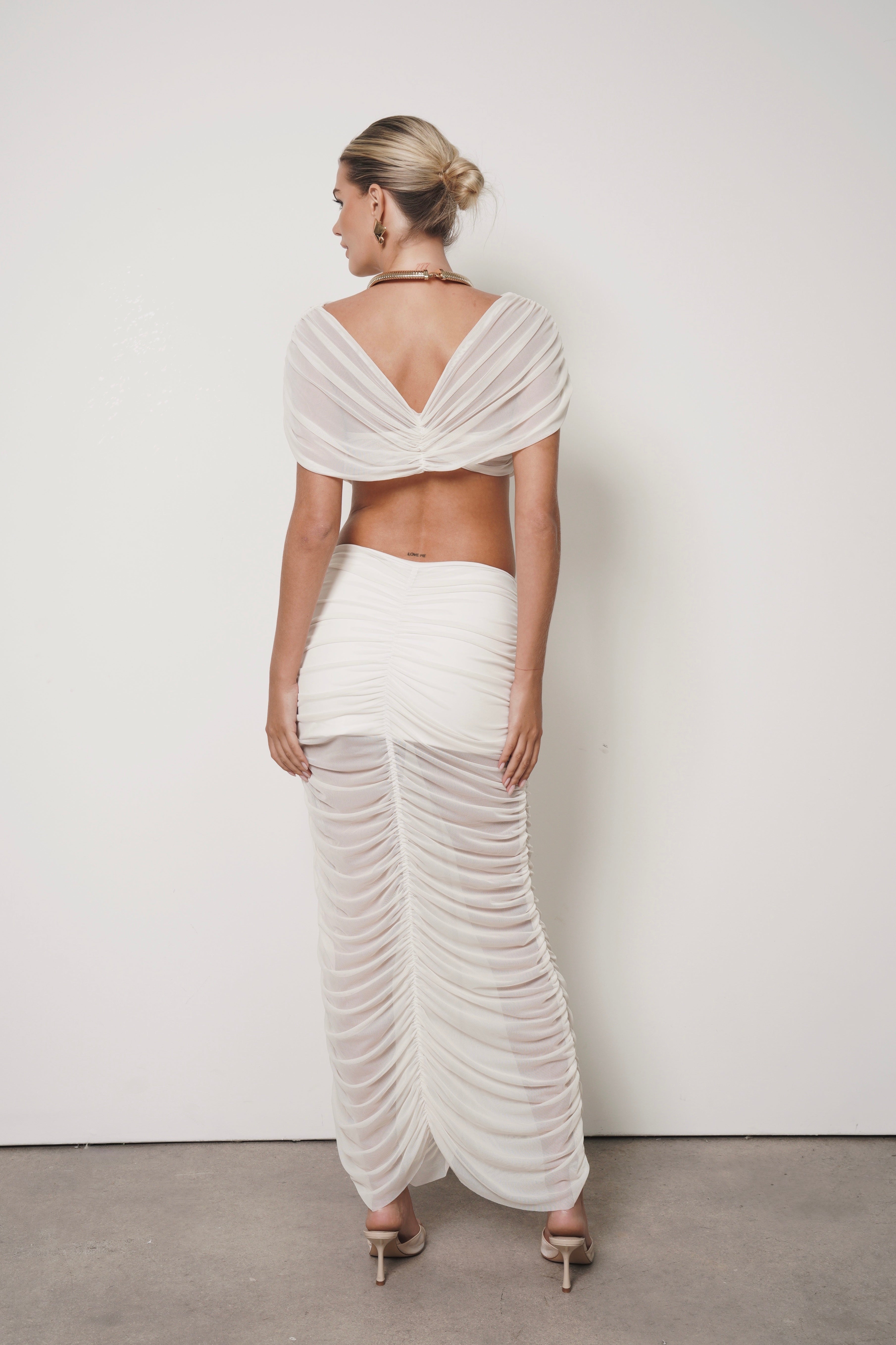 Fluida, estilizada y llena de movimiento. Esta falda en mesh drapeado abraza la figura con suavidad y aporta un toque sofisticado gracias a sus pliegues cuidadosamente diseñados. Una pieza moderna y elegante que eleva cualquier outfit.