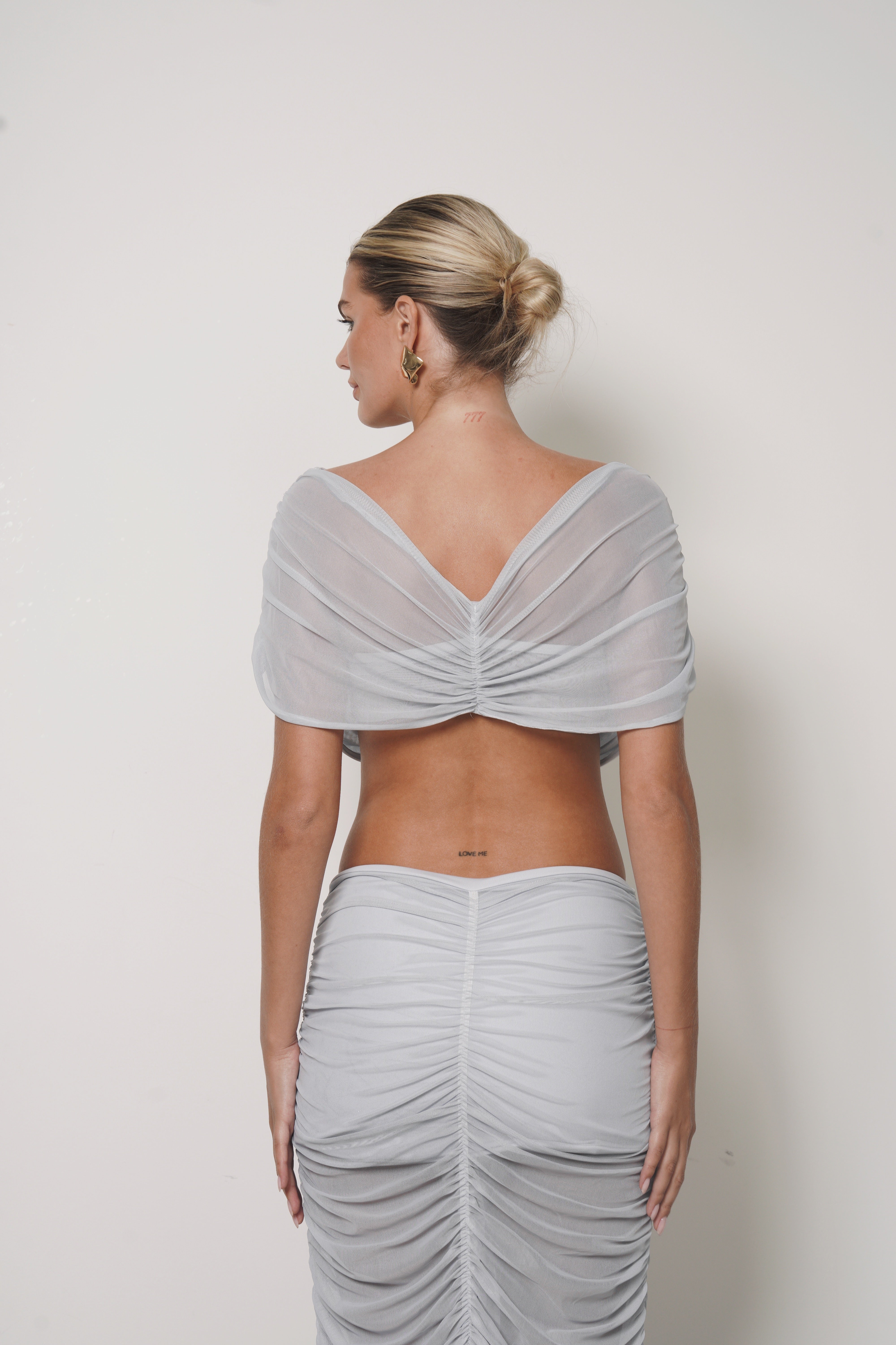 Un top que redefine la elegancia moderna. Confeccionado en mesh suave y adaptable, este crop top presenta drapeados estratégicos que realzan la silueta y crean un efecto visual hipnótico. Su diseño sofisticado convierte cualquier look en una propuesta poderosa y femenina.