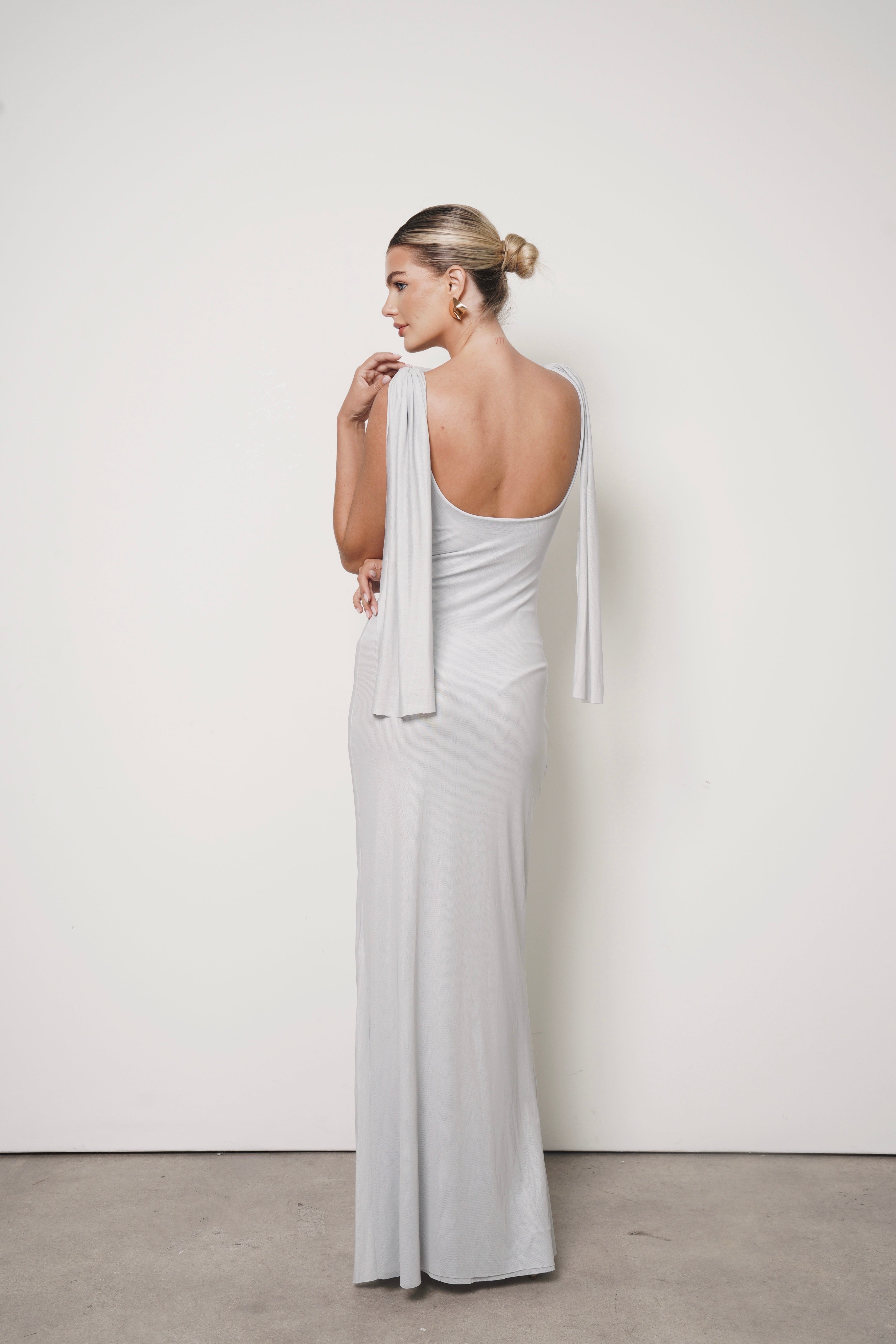 Una pieza híbrida y elegante. Este vestido tipo bodysuit combina una falda en mesh con un escote acentuado por detalles metálicos. Su cuello bandeja y la espalda descubierta crean una silueta moderna y sensual a la vez.