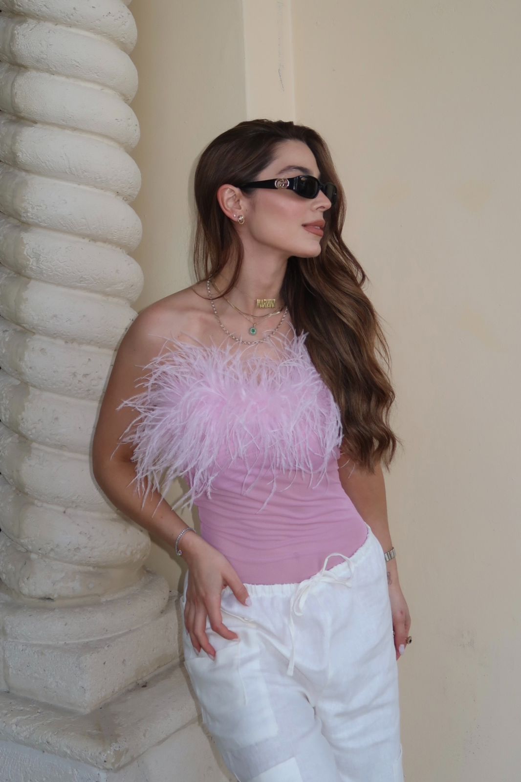 Romántico y glam. Este body strapless destaca por su escote adornado con plumas que enmarcan el busto con suavidad y elegancia. Una prenda perfecta para eventos, salidas nocturnas o momentos donde quieras destacar.