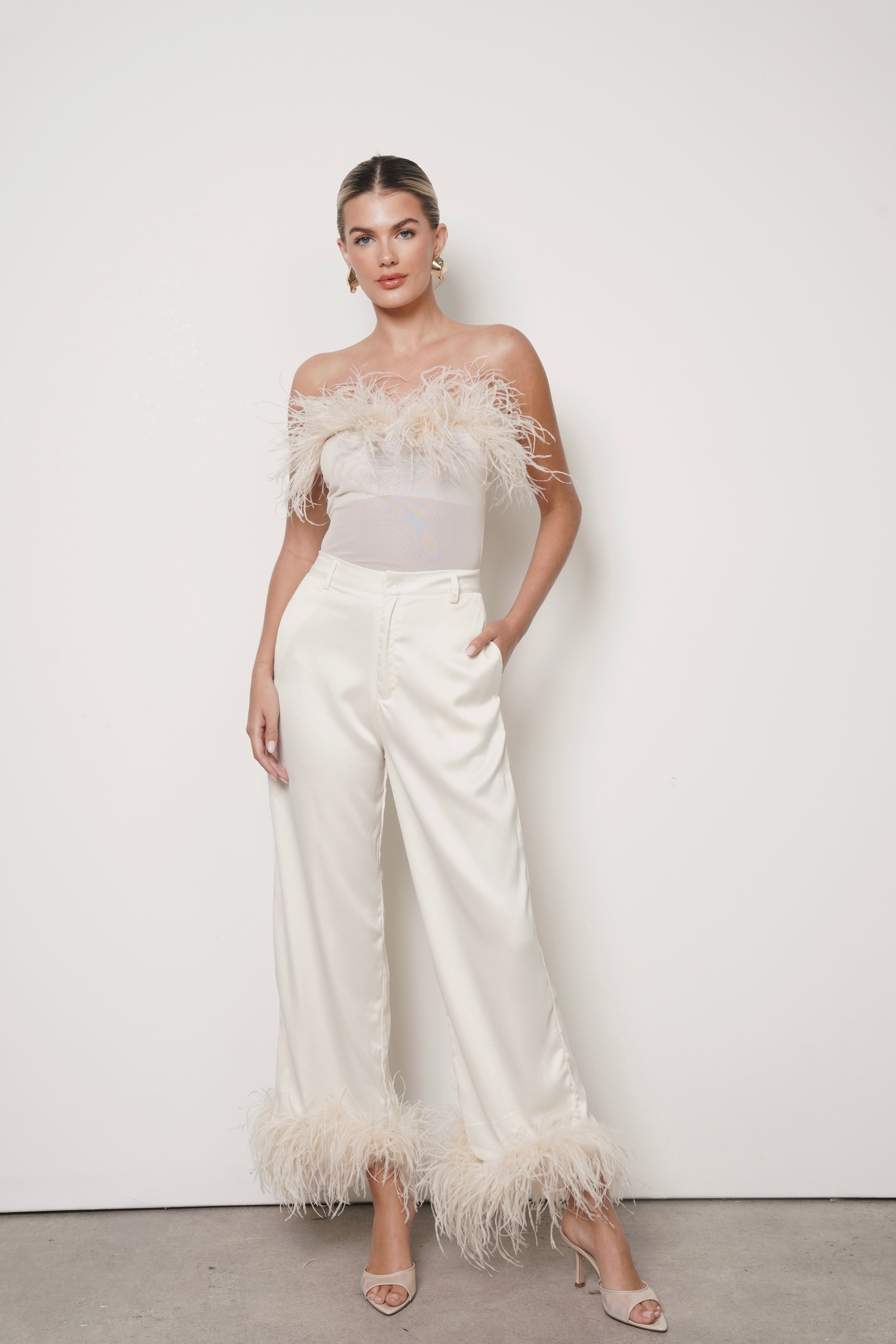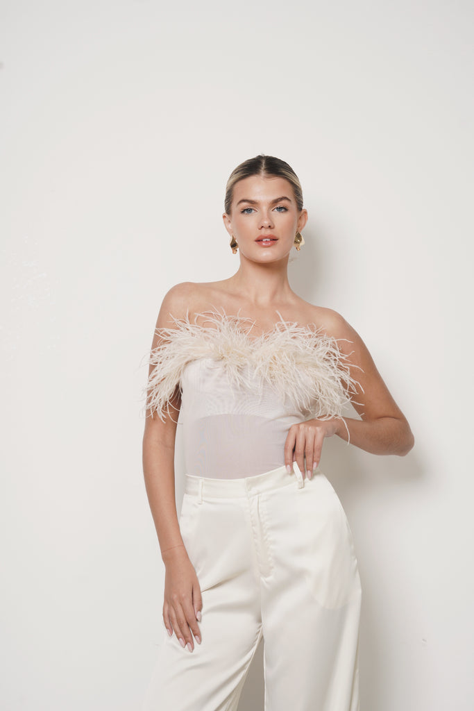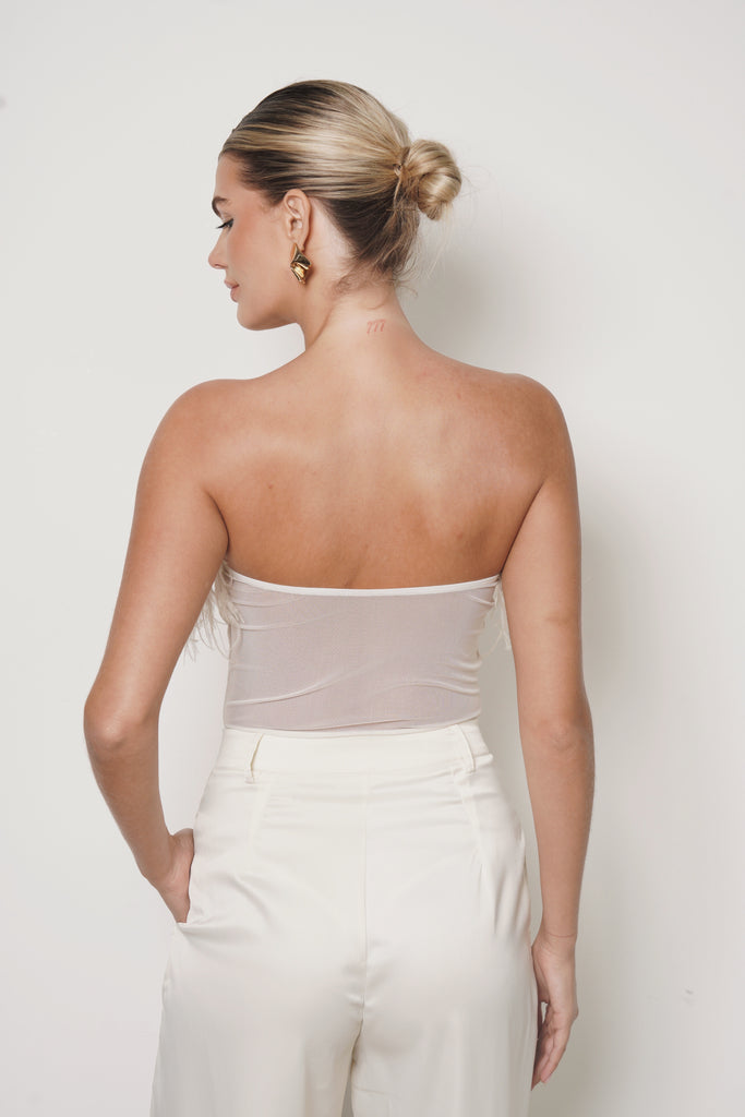 Romántico y glam. Este body strapless destaca por su escote adornado con plumas que enmarcan el busto con suavidad y elegancia. Una prenda perfecta para eventos, salidas nocturnas o momentos donde quieras destacar.