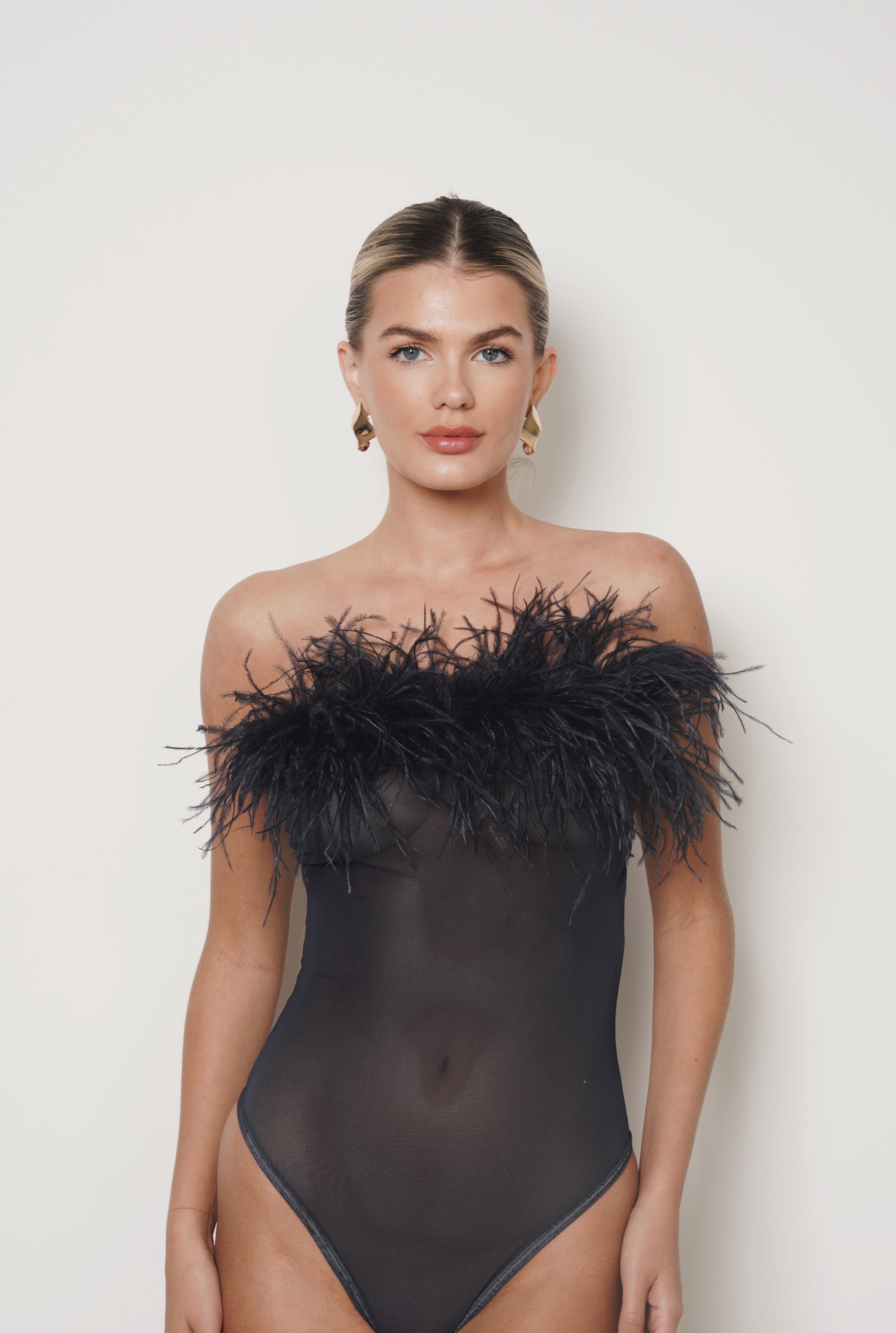 Romántico y glam. Este body strapless destaca por su escote adornado con plumas que enmarcan el busto con suavidad y elegancia. Una prenda perfecta para eventos, salidas nocturnas o momentos donde quieras destacar.