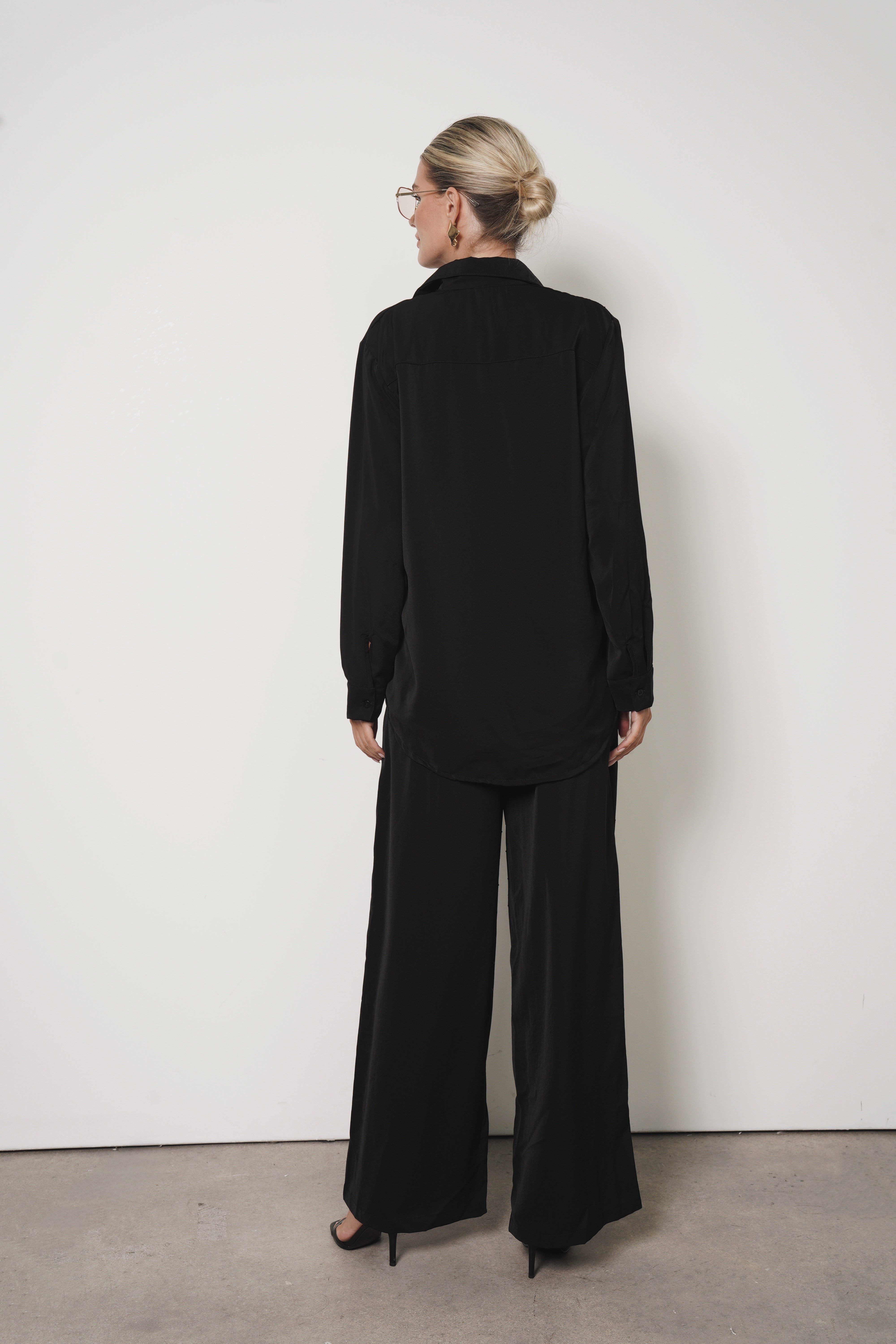 Una combinación suave, femenina y sofisticada. Este set en tono beige, con camisa manga larga y pantalón en tela sedosa, incluye delicados detalles en cristales Swarovski que lo transforman en una propuesta fresca y chic para el verano.